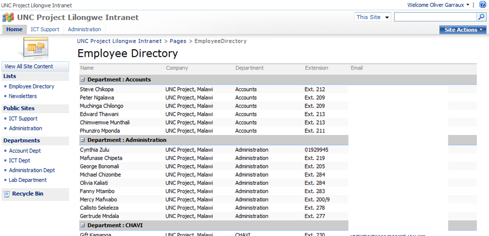 On the main employee directory, I have a DataView WebPart that uses the web service as its data source. It lists information for all users. I have it grouping the employees by their department to make it easy to find. Each department site also has a department directory for added convenience. These ones use the second method that just returns the employee information for a particular department. They both have clickable mailto: links for the email addresses.