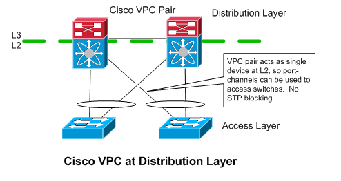 Like VSS, Cisco’s VPC allows you to have port-channels that terminate on different distribution layer switches (Nexus 7000 / 5000 / 3000’s). It’s implementation is different though. The switches in the VPC pair are less tightly coupled - they each have their own management and control planes. From a L2 perspective, the Nexus devices act as a single device, in that they appear as a single device to spanning tree, at the end of a port-channel. From a L3 perspective though, the Nexus devices are completely separate.