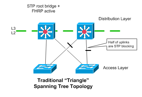 My diagram above shows two uplinks for each access layer device. In theory, you could have only a single L3 uplink on each of the access switches. This complicates things though - you’d either have to have L3 peering between the two access layer devices, or make sure that the device owning the default gateway / FHRP addresses will give up ownership if it loses its uplink. With the first option, if the switch owning the shared FHRP address loses it’s L3 uplink, it will continue to accept traffic for the default gateway’s address. Once the IGP reconverges though, that traffic would be forwarded across to it’s peer access switch/router, and then up to the distribution layer. With the second option, the switch that loses it’s uplink should let the owner switch take over ownership of the shared FHRP addresses.so that traffic destined to the rest of the network would never hit the switch without an uplink in the first place.