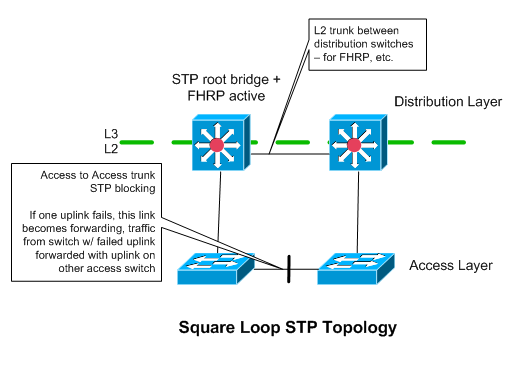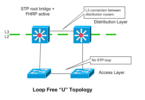 In this topology, each access switch has only a single L2 uplink to a single distribution layer device. Each pair of redundant access switches has a total of two uplinks - one to each distribution switch. The pair of access switches also have a L2 connection between themselves. This is used during a failure, and should have a high enough STP cost to ensure that Spanning Tree blocks it, as opposed to one of the uplinks to the distribution switches.